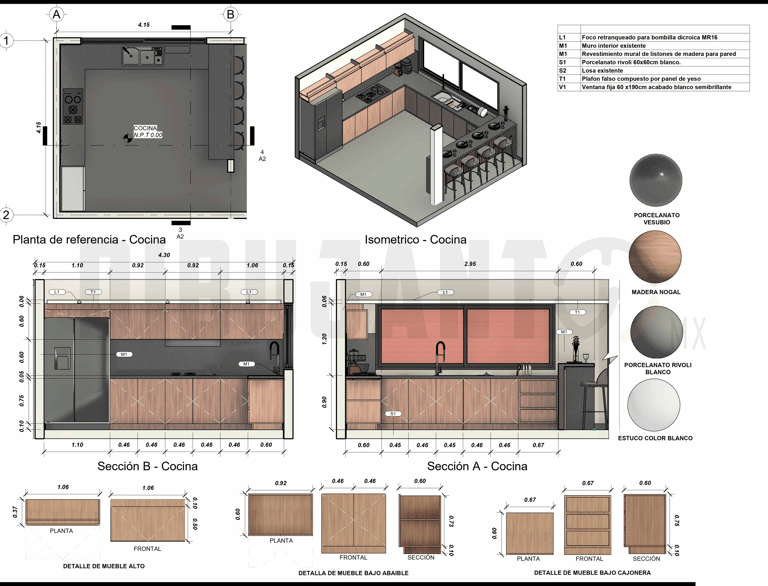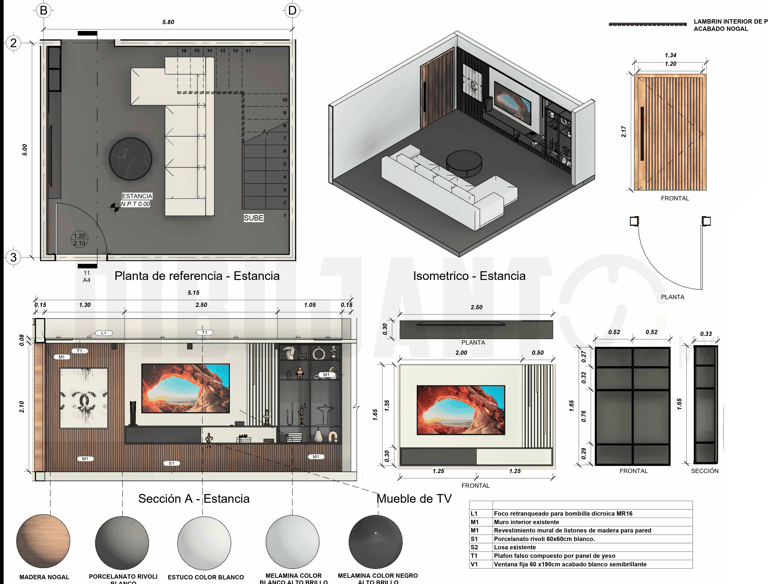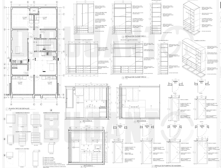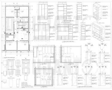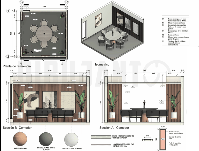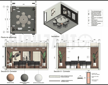 Modelado 3D de interiores completo. Además, se realizo la documentación de planos de interiores en los que se visualizan elementos de carpintería, cancelería, acabados y mobiliario.
